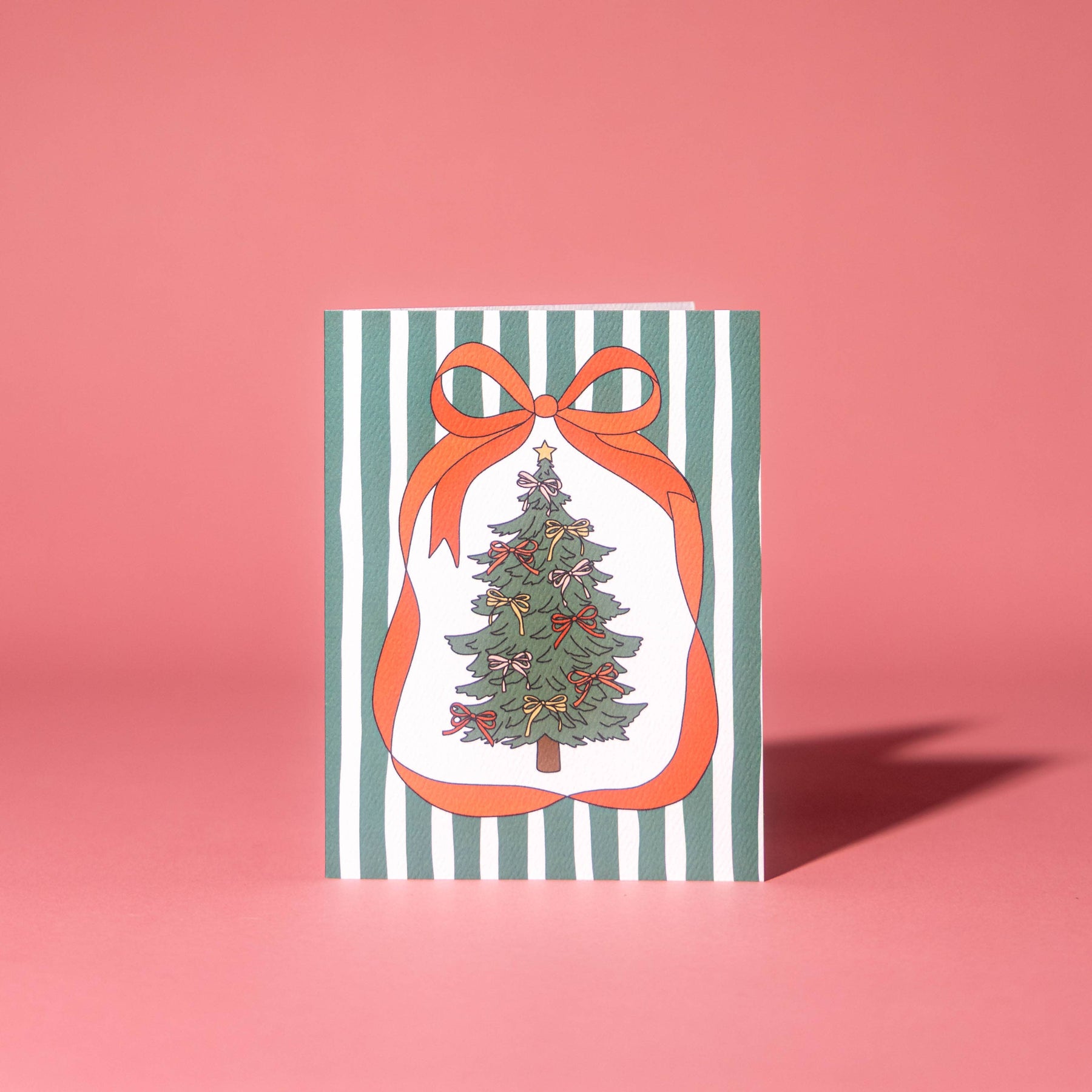 Classic holiday cheer with a playful twist! This card features bold green stripes, a statement red bow, and a festive Christmas tree adorned with mini bows - because you can never have too many! It’s a joyful design that feels like a perfectly wrapped present, ready to deliver your warmest wishes.