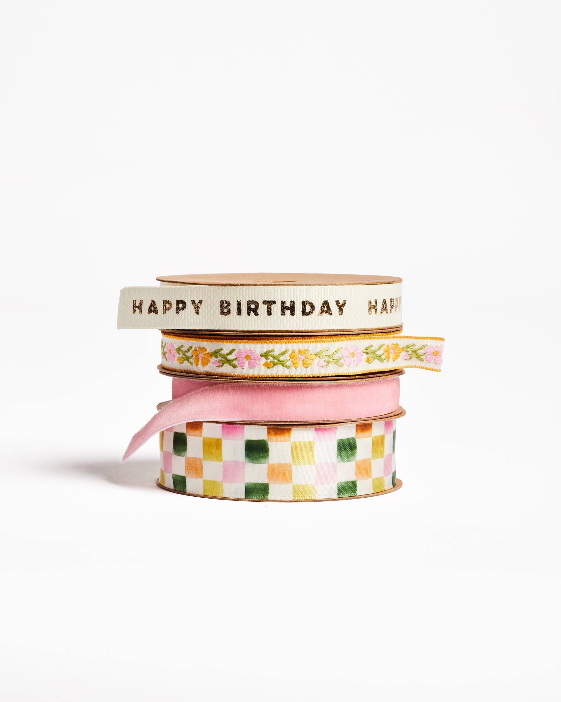Cream grosgrain ribbon printed with gold foil "Happy Birthday" 5 yards kraft spool printed with gold foil