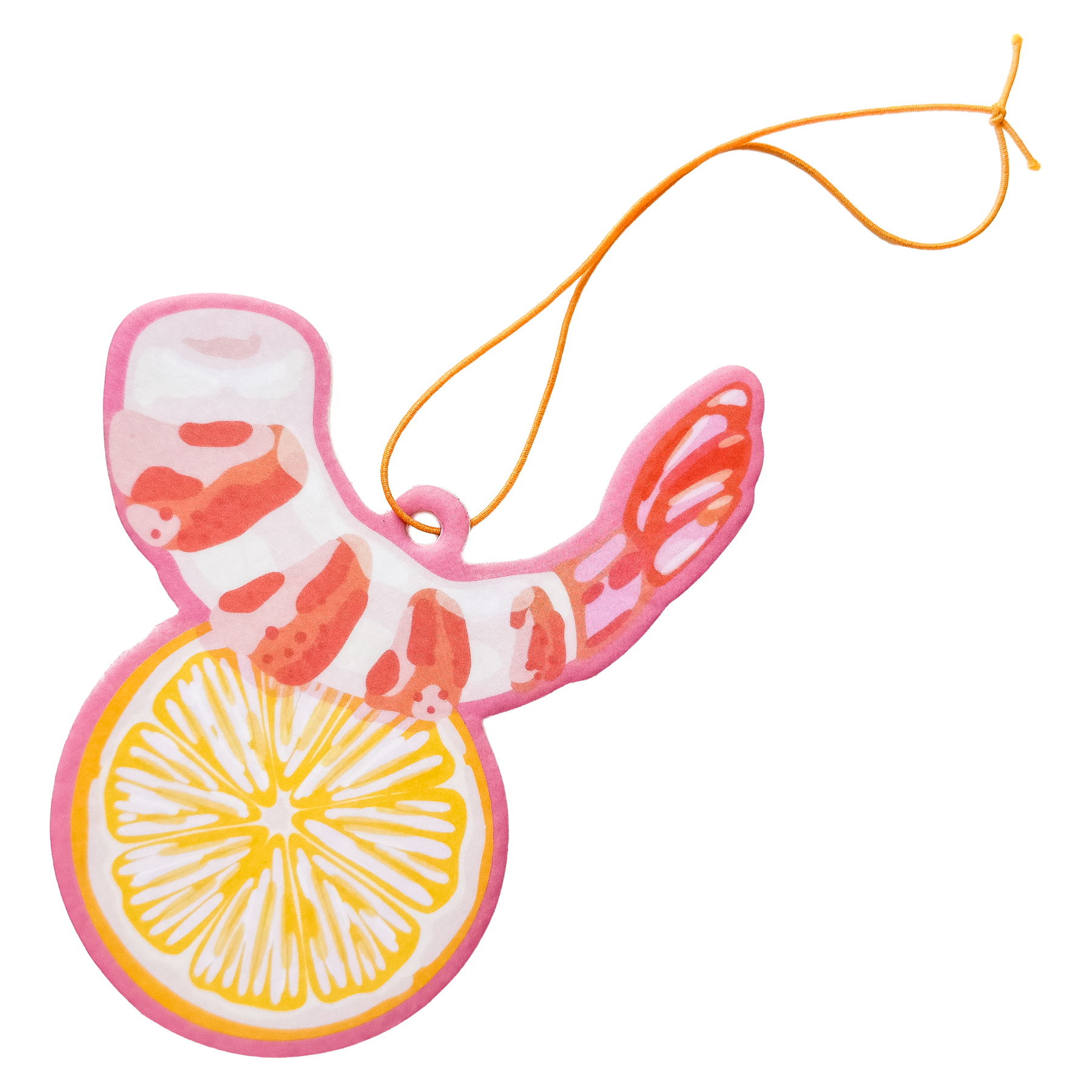 Serving shrimp and side-eye. Zesty lemon scent with big appetizer energy. This shrimp cocktail air freshener is classy, brassy, and ready to freshen the room and the mood.
