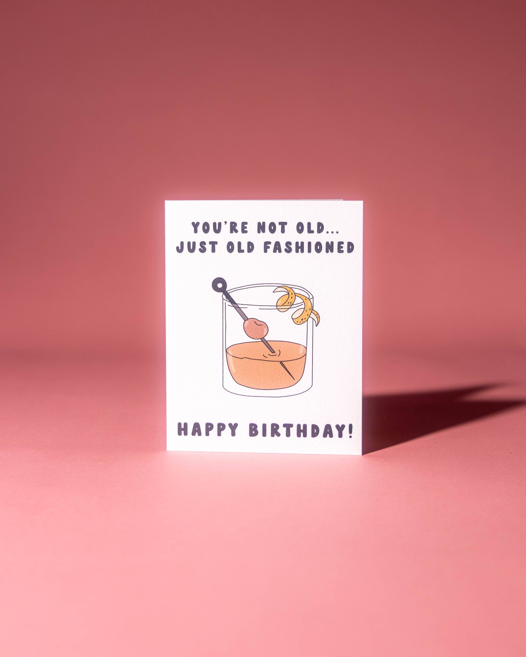 Raise a glass to aging gracefully (and stylishly)! This cheeky birthday card features a hand-drawn illustration of a classic old fashioned cocktail, paired with bold black lettering that reads: "You're not old... just old fashioned." Perfect for whiskey lovers, cocktail connoisseurs, and anyone who appreciates a good pun.