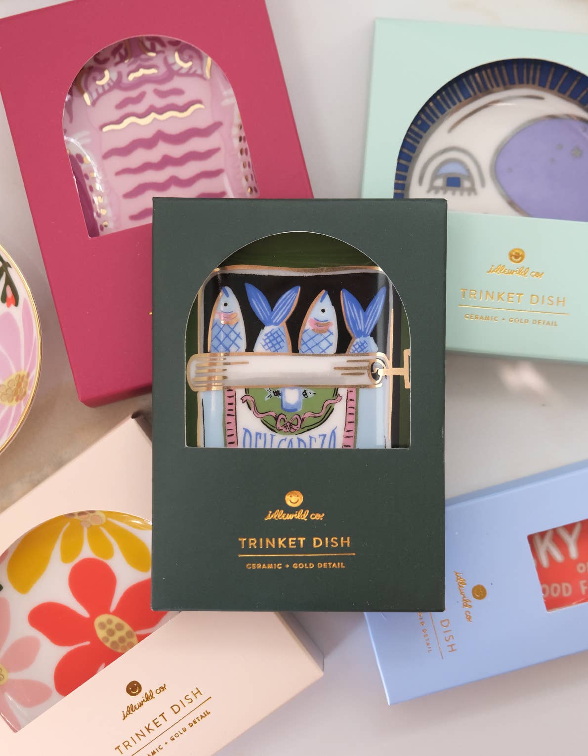 A fan favorite giftable–Our ceramic trinket dishes are the perfect catchall for your nightstand or dresser. White porcelain is adorned with our colorful, hand-painted designs, and we lined the edge in 10k gold for added flair. Perfectly packaged in plastic-free gift boxes, pretty enough to give without wrapping! • 3.25″ x 4.5″ Dish • Ceramic with 10k Gold Detailing • Plastic-Free Gift Box Keywords for SEO: Trinket Dish, Dish, Ring Dish, Ceramic, Porcelain, Gold, Idlewild Co., Idlewild, Accessory, Gift, Stocking Stuffer, Jewelry Dish, Jewelry Box, home decor, vintage, display, earring display, displays for retail, gift idea, wedding, ceramics, engagement gift, jewelry displays, necklace display, ring dish, snake, rainbow, nature