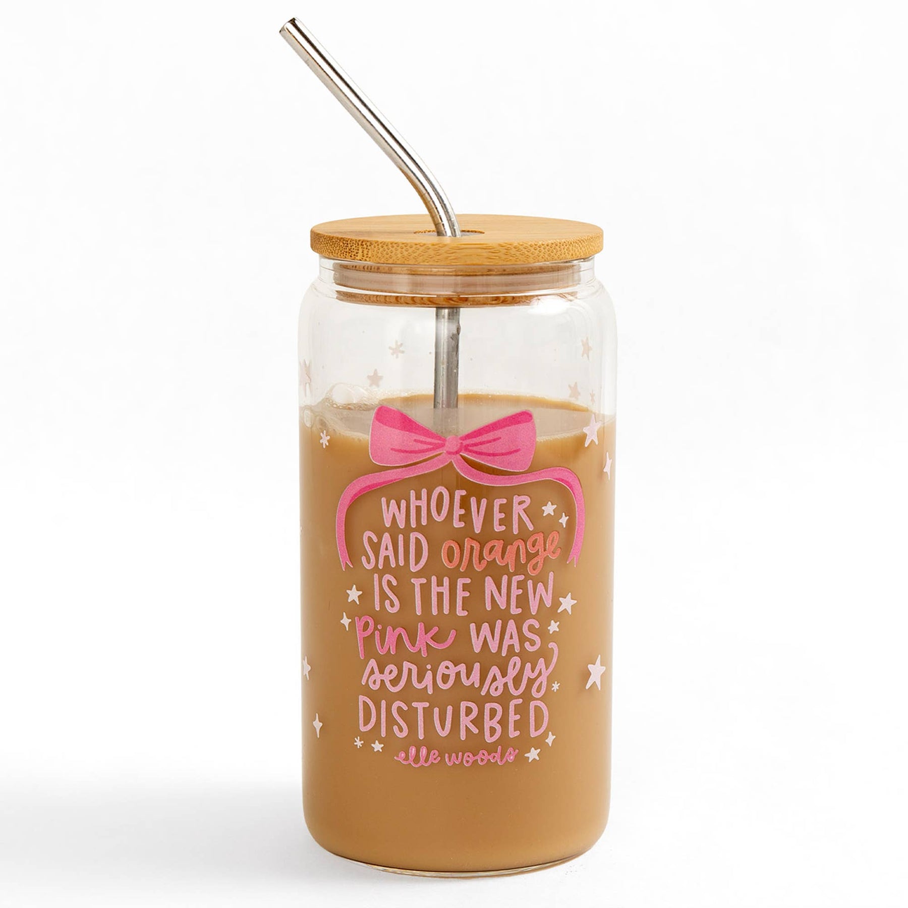 Make a bold statement with our New Pink Glass Can, inspired by the iconic movie, Legally Blonde! Featuring a playful coquette bow design and the famous Elle Woods quote 'Whoever said orange is the new pink was seriously disturbed', this glass can adds a touch of sass and style to any beverage. Whether you're sipping your morning coffee, afternoon tea, or a refreshing sparkling water, let your inner Elle Woods shine through. Ideal for Legally Blonde fans or anyone who loves a pop of pink, our New Pink Glass Can makes a fabulous gift for birthdays, holidays, or any special occasion. Embrace your unique style and raise a glass to all things pink!