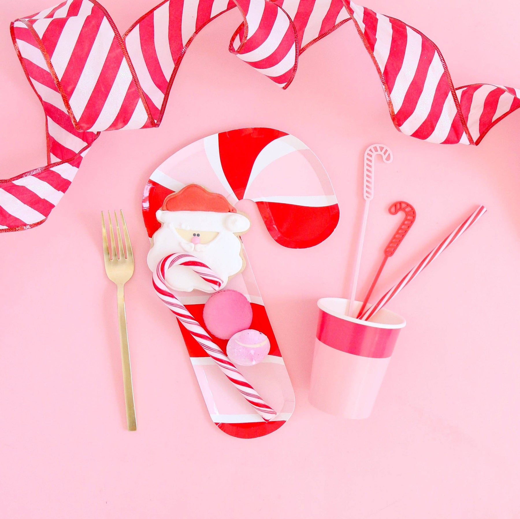 Make your cookie decorating party festive with these red and pink candy cane dessert plates. Measure 11" tall by 6.5" wide. Set of 8.