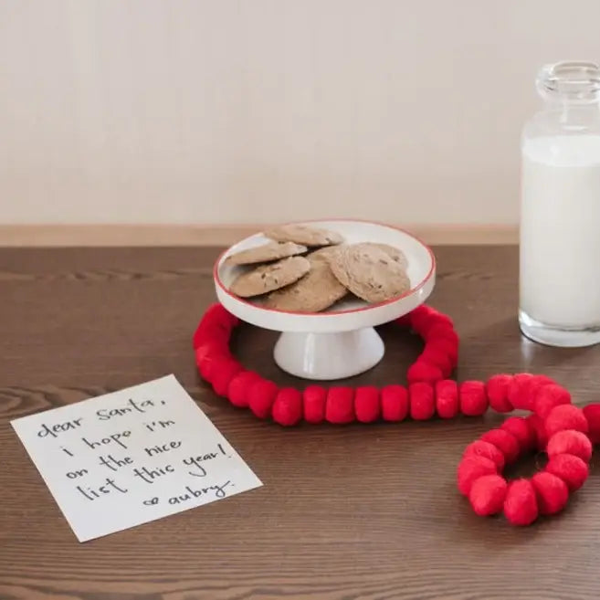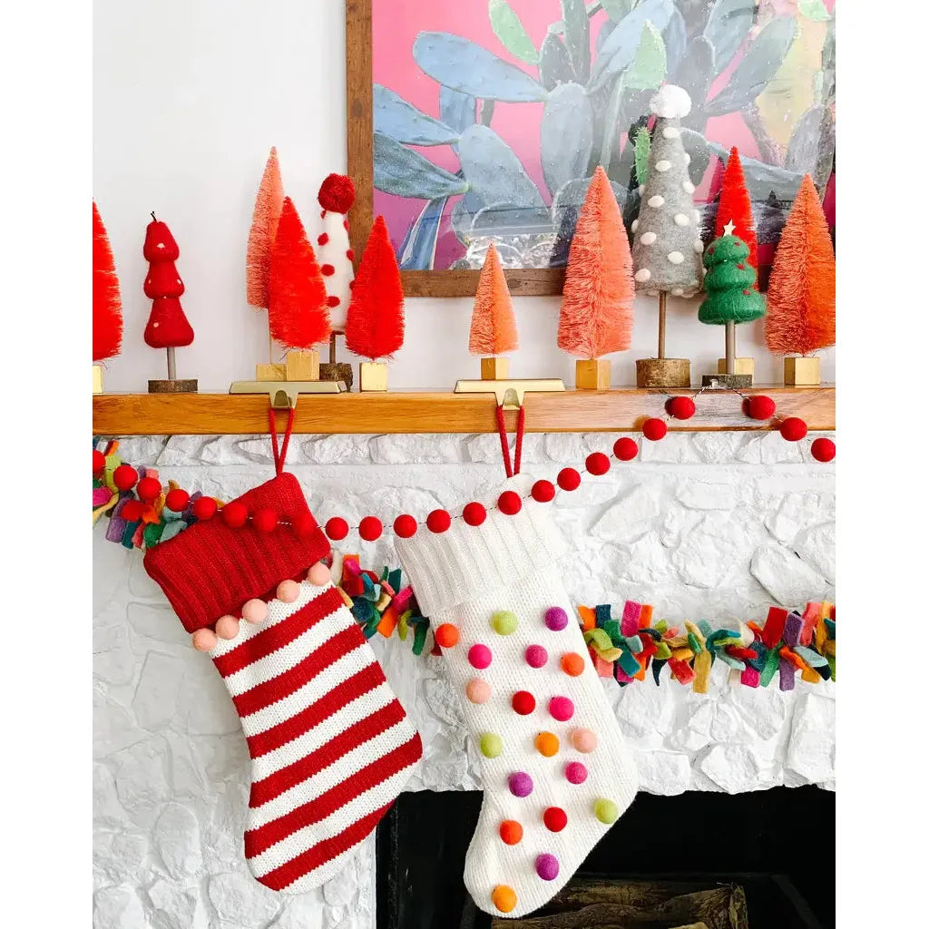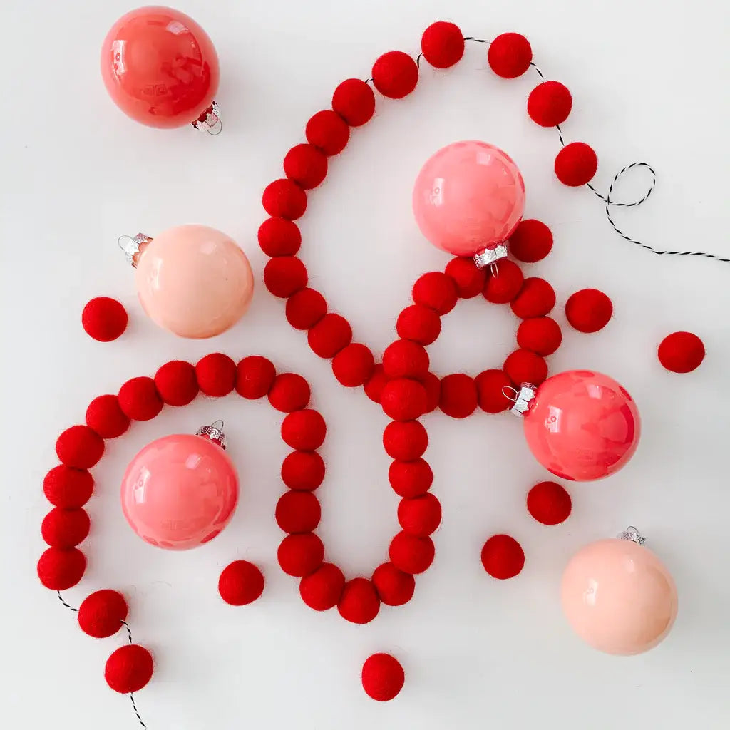 Sweets garland in a traditional Christmas red. 72" pre-strung garland Hook loop finishes 100% wool felt balls Made in Nepal