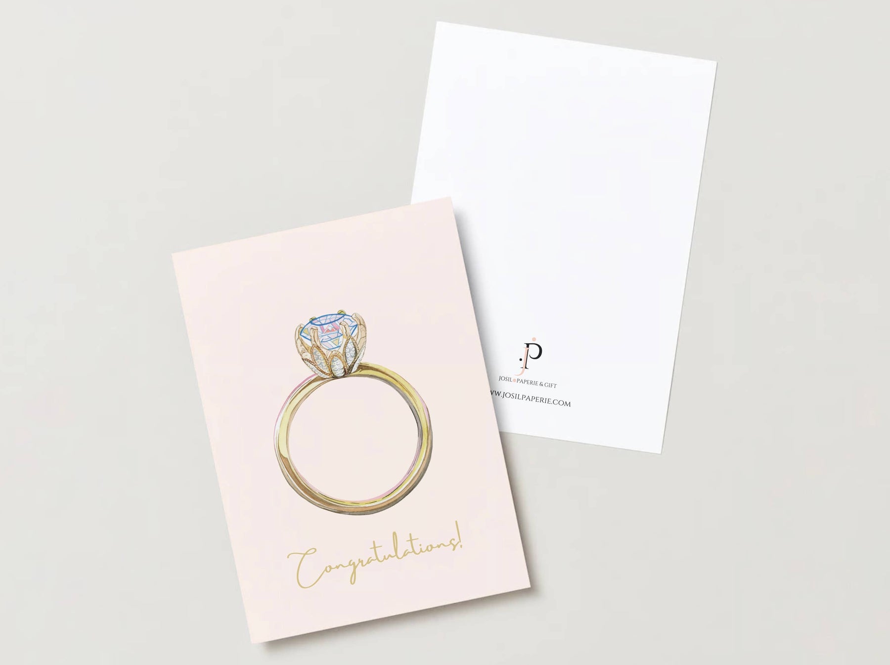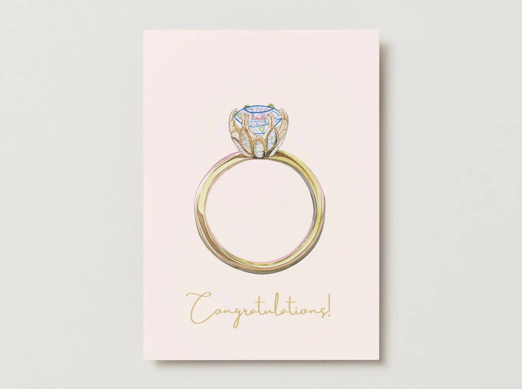 This Giant engagement ring card is the perfect "Congrats" to the bride to be Paper: bright white heavyweight paper Envelope color: bright white Size: A7 folded 5” x7” Interior: blank inside Each card is packaged in a sealed cello bag.