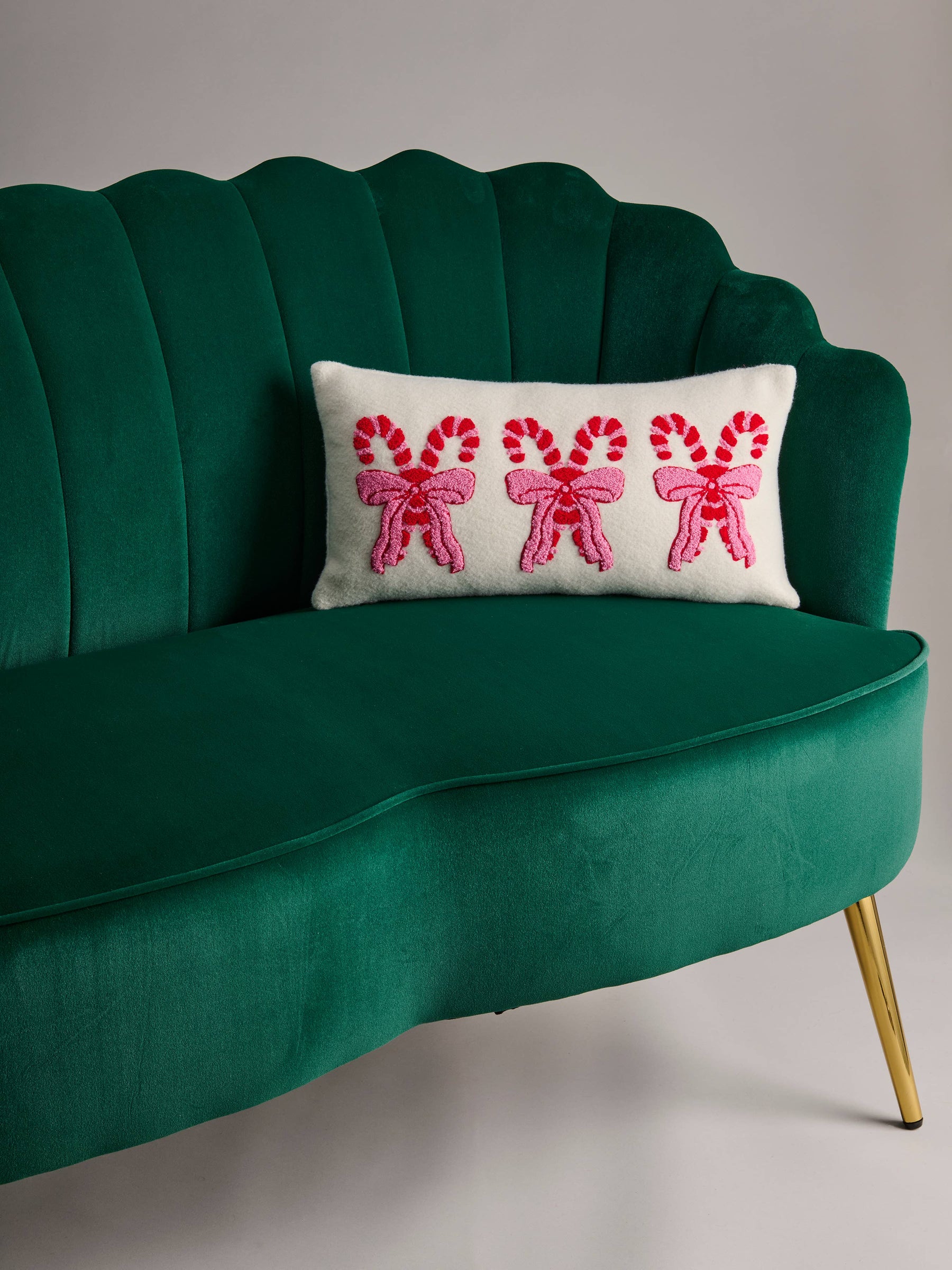 This cream-colored lumbar pillow features three candy cane pairs, each tied up in sparkly pink bows with vibrant red embroidery. Its festive, feminine design brings a playful pop to your sofa, bench, or bed. Complete with a removable polyfill insert, it’s as functional as it is fabulous.
